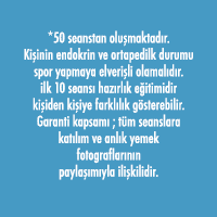 *50 seanstan oluşmaktadır.Kişinin endokrin ve ortapedilk durumu spor yapmaya elverişli olamalıdır. ilk 10 seansı hazırlık eğitimidir kişiden kişiye farklılık gösterebilir. Garanti kapsamı ; tüm seanslara katılım ve anlık yemek fotograflarının paylaşımıyla ilişkilidir.